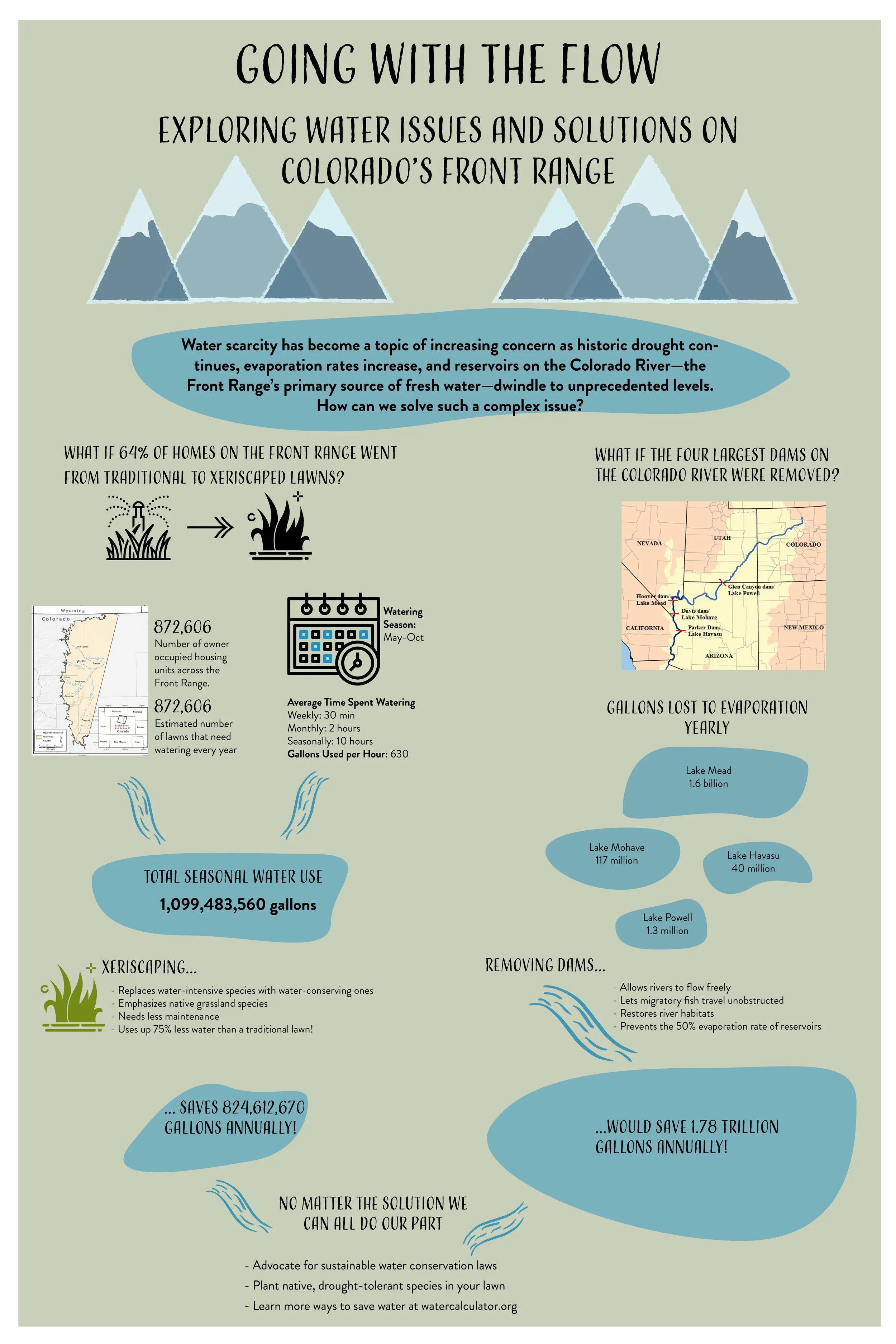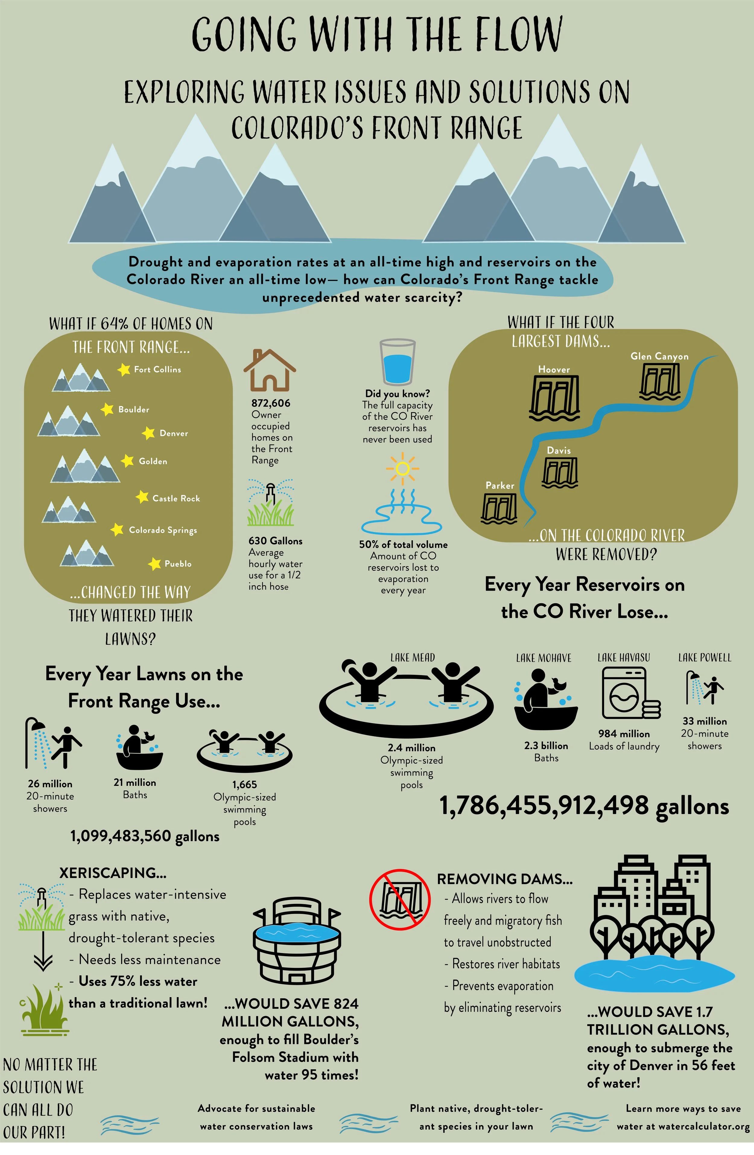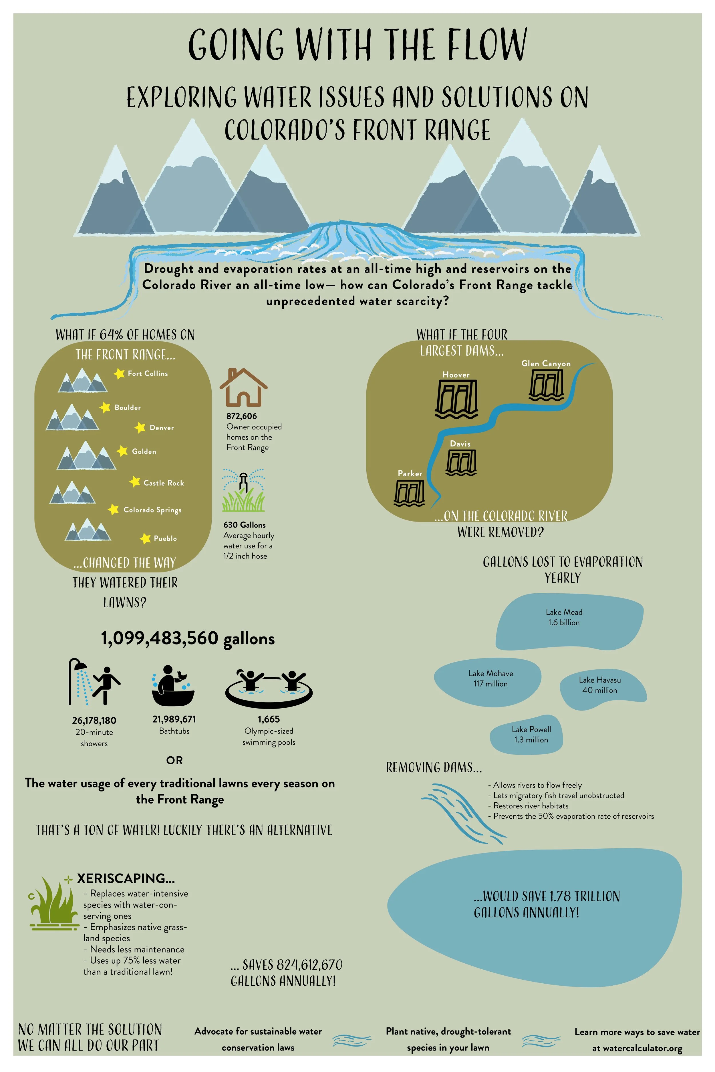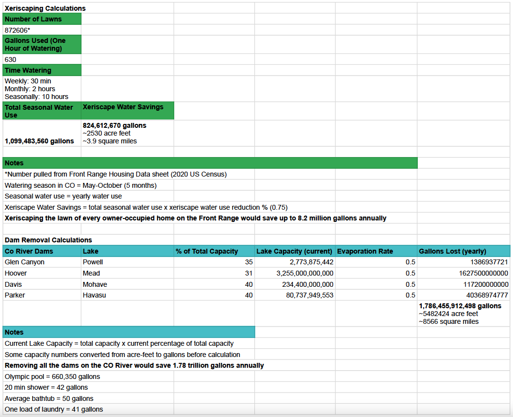 Using existing data and my own calculations, I determined the quantitative impact of two different approaches to water conservation in the West: xeriscaping the lawns of every homeowner on the Front Range or removing the four largest dams on the Colorado River.